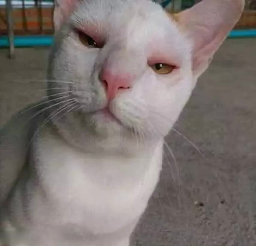 本来是卡姿兰大眼睛的白猫,被蛰两下后眼睛酿成了一条缝——不外还好,两只眼睛对称得很!