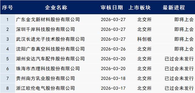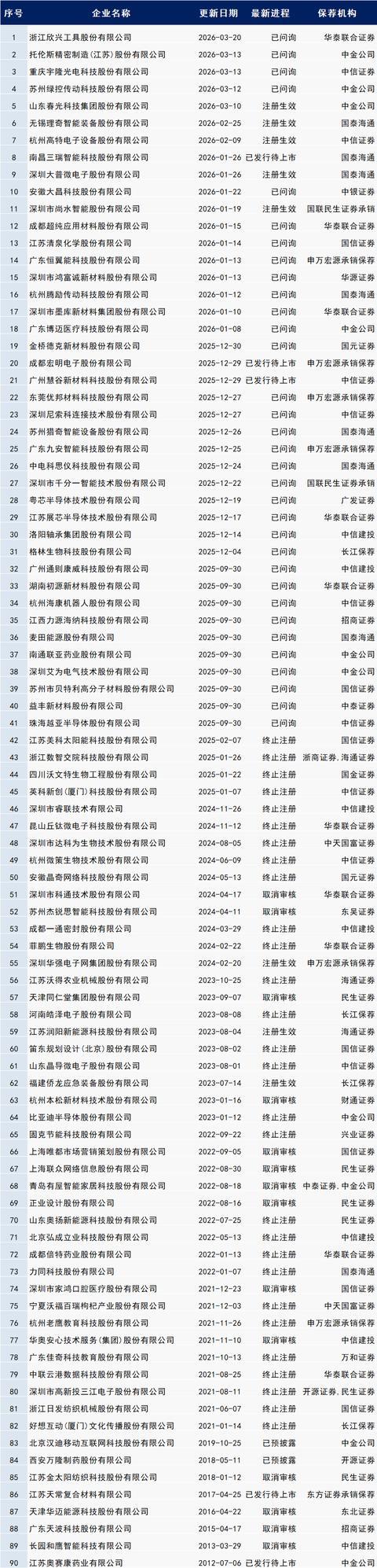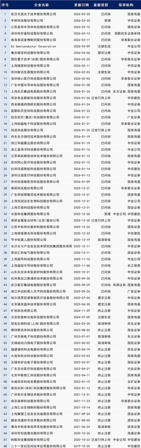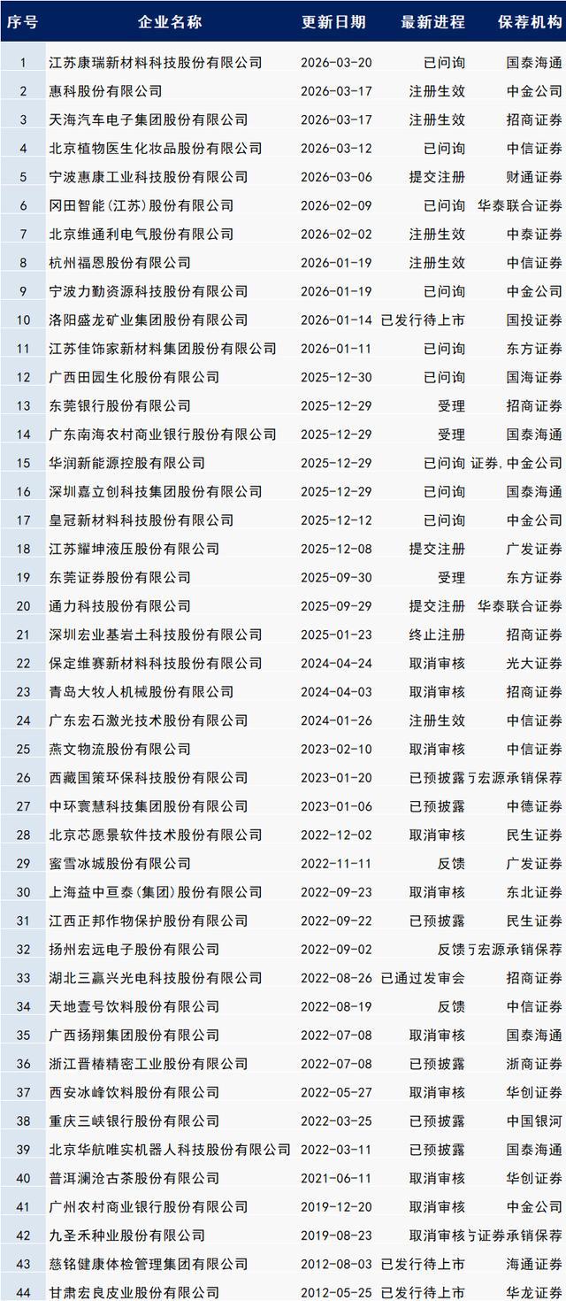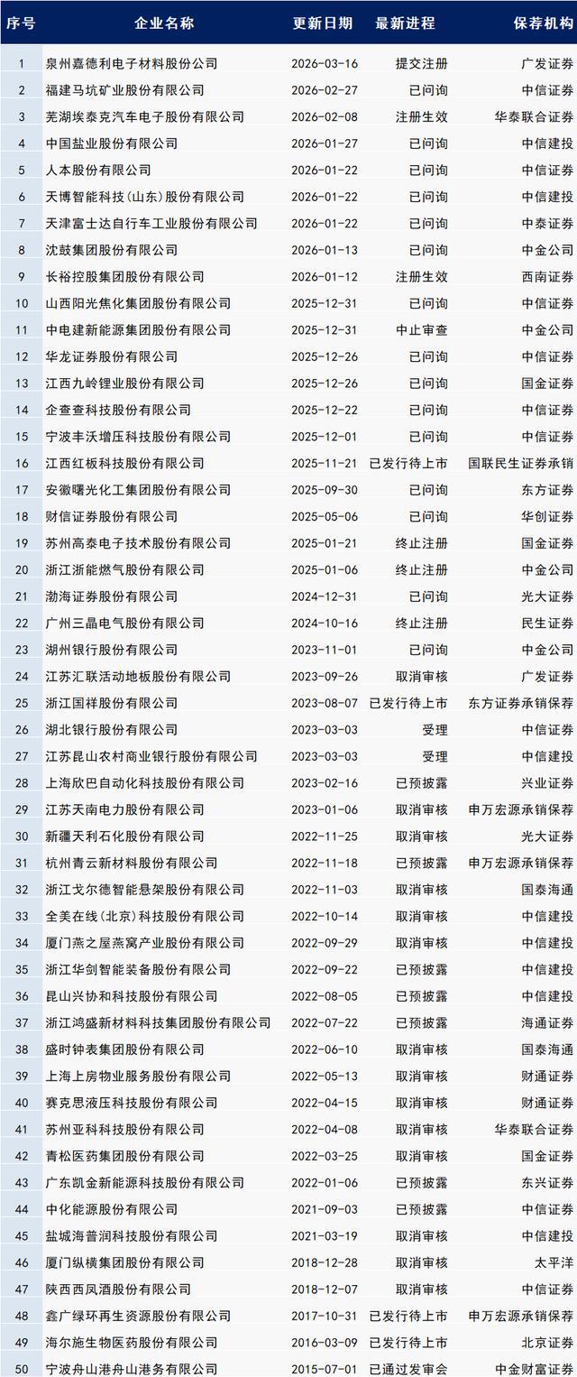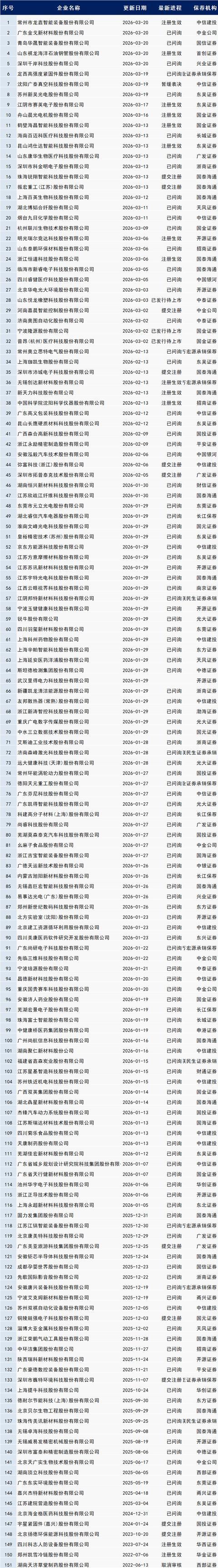 以下最新IPO程度中包含:已预清楚、受理、已问询、已刊行待上市、暂缓表决、中止审查、响应、已通过发审会、提交注册、注册见效。