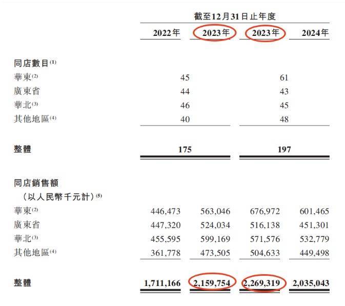 2024年,绿茶的同店销售额下滑了10.3%,而2023年还同比增长26.2%。令东说念主疑忌的是,在招股书中,绿茶吞并年份的同店销售额数字却不交流。
