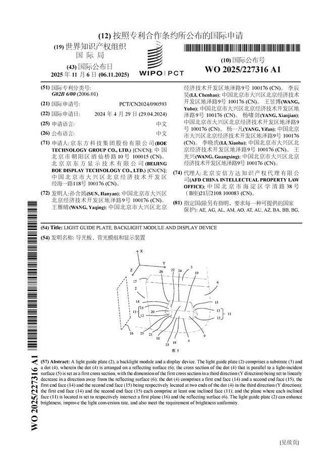 证券之星音讯,把柄企查查数据线路京东方A(000725)公布了一项海外专利肯求,专利名为“导光板、背光模组和线路安装”,专利肯求号为PCT/CN2024/090593,海外公布日为2025年11月6日。